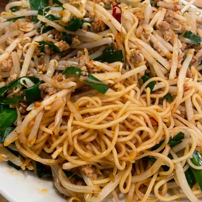 麺は自家製でかための細麺、具材はニラ、モヤシ、挽肉などを自家製麻辣醤、自家製宮保(クンポウ)タレを使用し、中華鍋で強火で香ばしく炒めてあるとのこと。