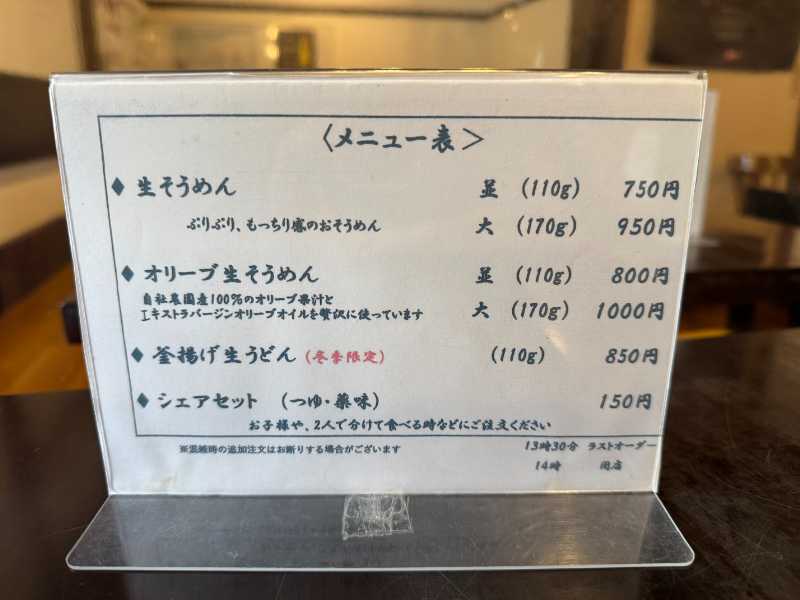 今回は同行者と2人での訪問なので、「生そうめん」と「オリーブ生そうめん」をそれぞれ注文し、シェアしながらいただきました。