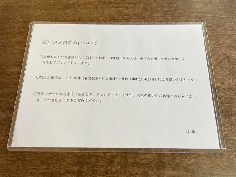 大根おろしは一般的な「青首大根」を使用するお店もあれば、「ねずみ大根」や「板垣大根」といった「辛味大根」を使用するお店、ブレンドするお店など様々で、決まりはないようです。