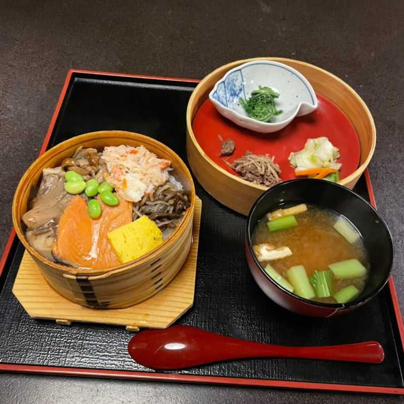 五種輪箱は鮭、カニ、きのこ、玉子、山菜など5種類の具材が乗った輪箱飯で、層が厚く、見た目より沢山入っていて豪華。