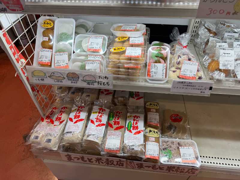 目当ての「かんば餅」は「松本米穀店」というお店の商品が販売されており、棹状のものや、カットタイプ、黒糖入りなどがありました。