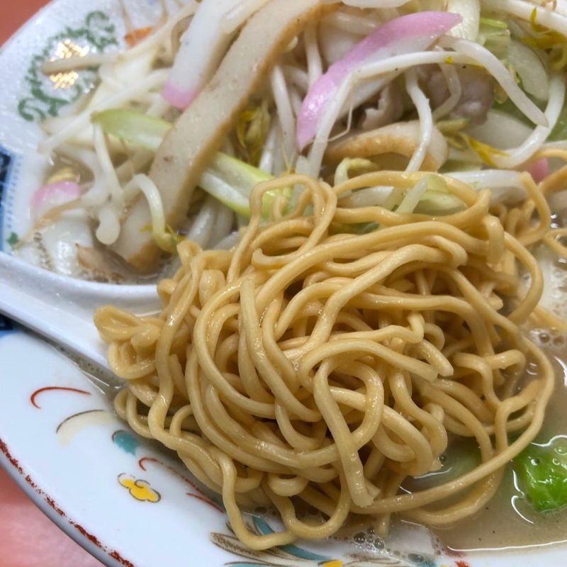麺は平打ち形状の細縮れ麺で、ポソポソしつつプツッとした歯切れが良い独特の食感で、一般的なちゃんぽんからはかけ離れたタイプの麺です。
