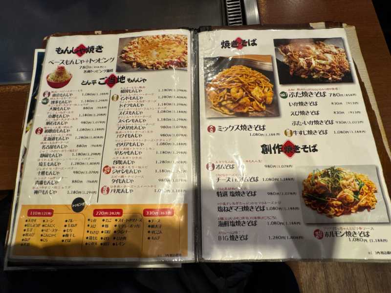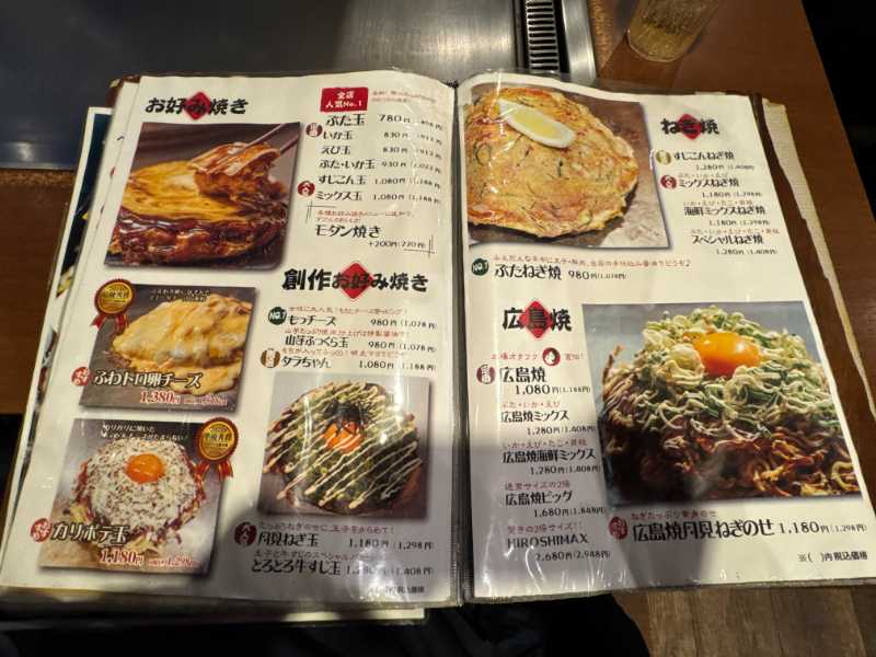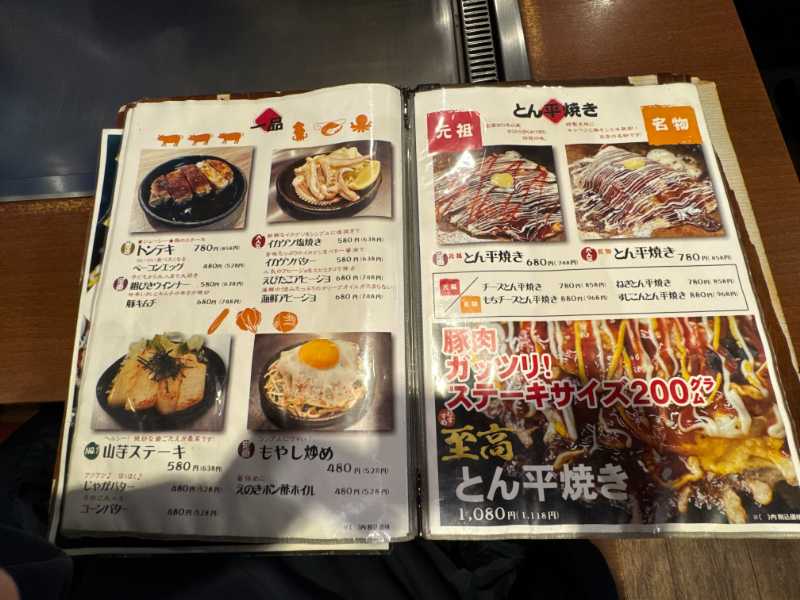 目当ての「とん平焼き」は創業以来のメニューという円形の「元祖」と、特製生地でキャベツ・豚・半熟玉子を包んだ「名物」の2系統があり、それぞれチーズ、もちチーズ、ねぎ、すじこんなど、トッピングにバリエーションがあります。