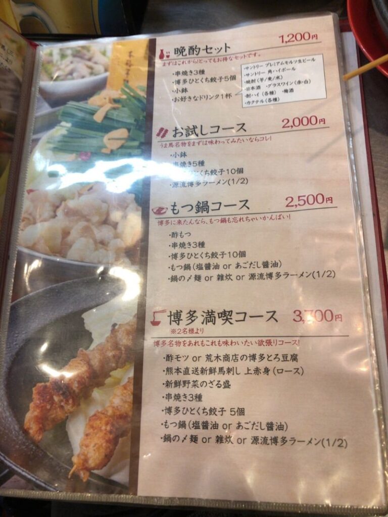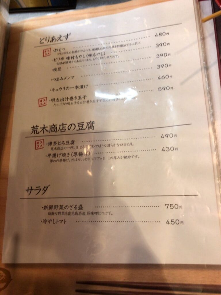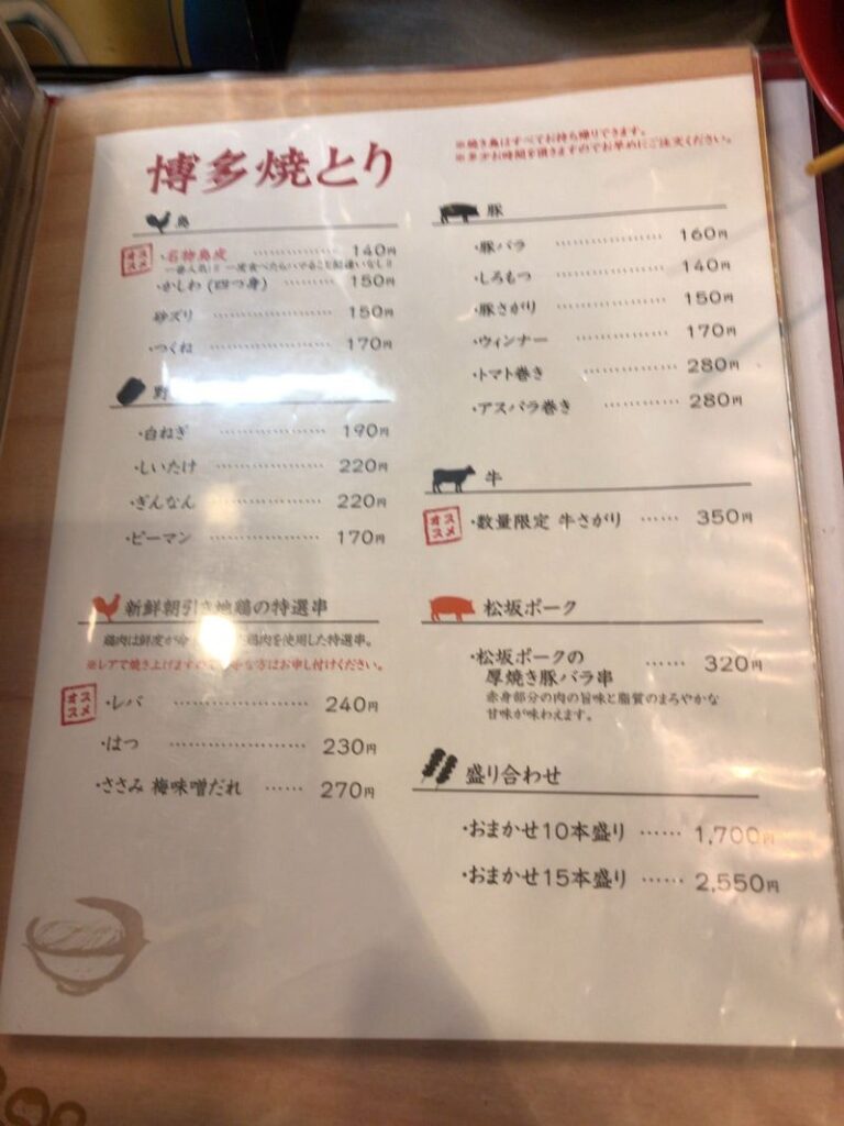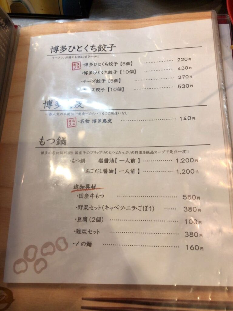 メニューの最初の方にラーメンが出てくるものの、焼き鳥やもつ鍋、ひとくち餃子など、博多名物も取り揃えたラインアップ。
