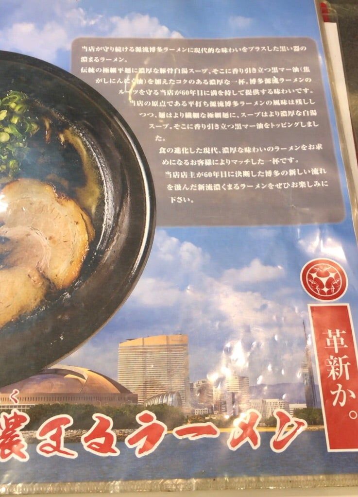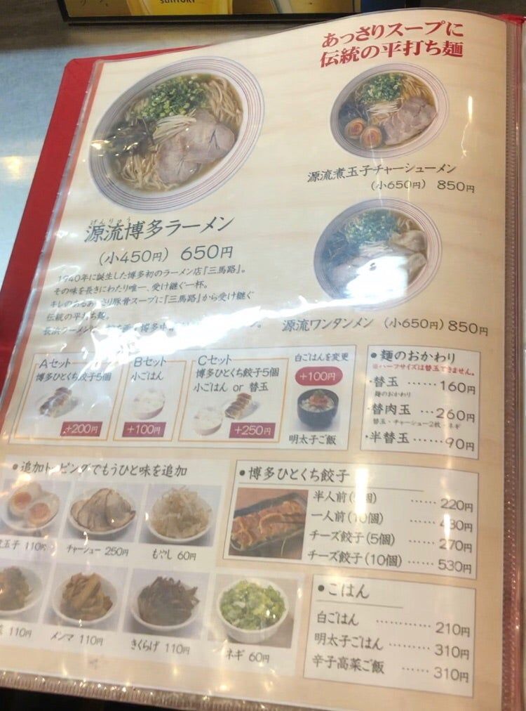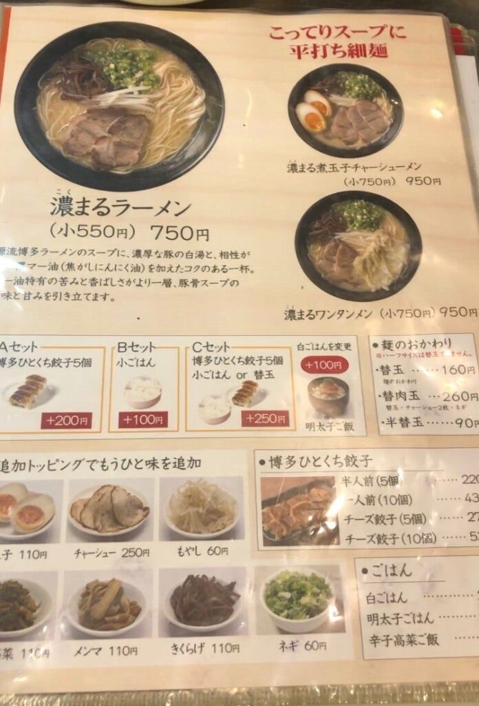 ラーメンは「三馬路」がルーツのあっさりした「源流博多ラーメン」と、濃厚なタイプの「濃まるラーメン」がありました。
