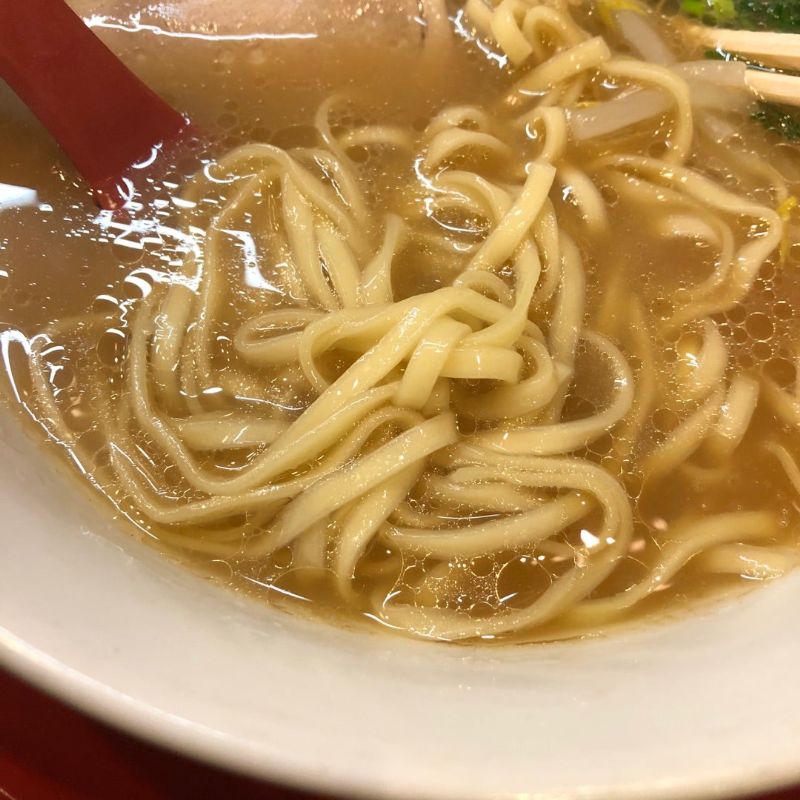 昔ながらの博多ラーメンのお店は、今は主流になっている極細麺ではなく、平打ち麺なのが面白いポイント。