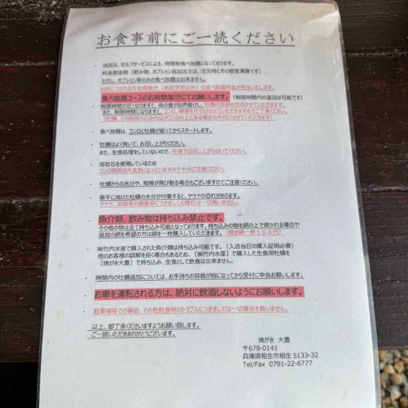 ●魚介類と飲み物の持ち込みは禁止で、持ち込みの具材を網で焼く場合は追加の網1枚100円を購入する必要あり。