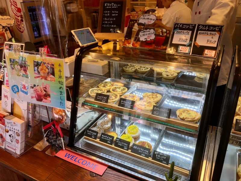 ショーケース内にはトマト系をメインに様々な種類のタルトやパイが並び、ソフトクリームやかき氷といったスイーツもありました。