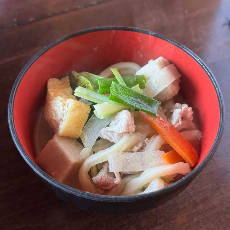 鉄鍋の中にうどんがギッシリと入っているので、見た目ではわかりにくいですが、下の方に根菜類や豚肉もたっぷり入っていてボリューム満点。