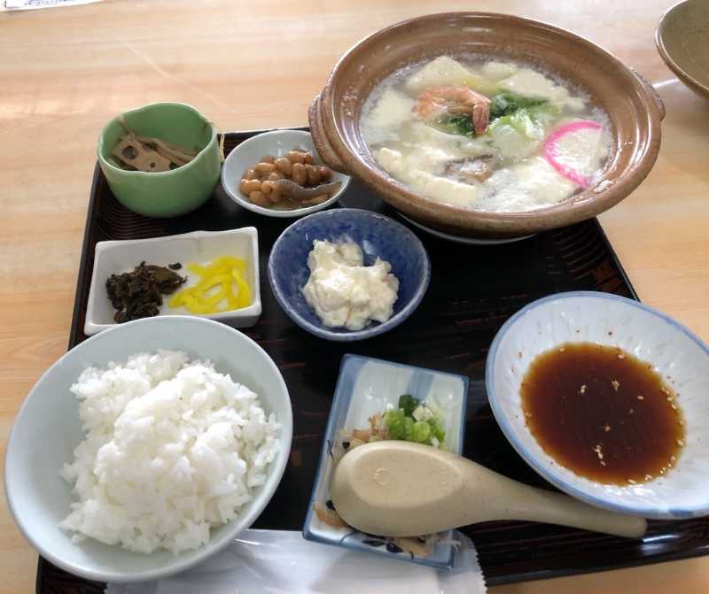 定食の内訳は具材入りの寄せ湯豆腐、タレ、薬味、小鉢類、ご飯、漬物。